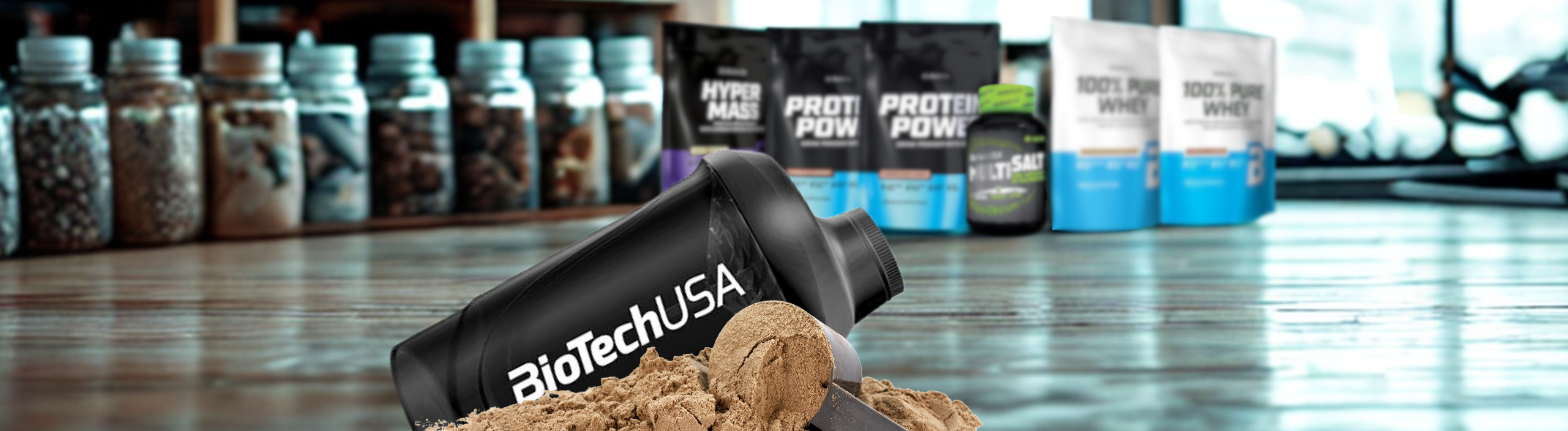 Produkterne til jobbet: BiotechUSA 100% Pure Whey Protein i lækre smagsvarianter som Caramel-Cappuccino og Chokolade.