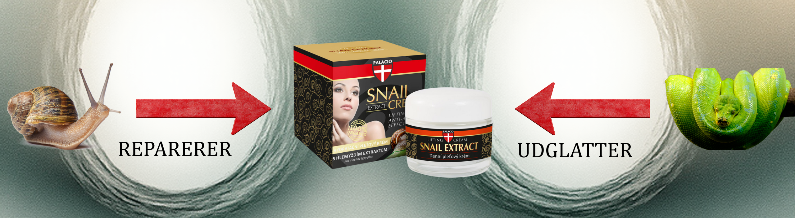 Vælg PALACIO Snail Extract Anti-age Face Cream, hvis... ...du vil have den komplette "alt-i-en" pakke. Du får både den reparerende, fugtgivende og glød-givende effekt fra snegleslimet, PLUS den ekstra bonus-effekt af det rynke-udglattende SYN-AKE peptid. Det er den ultimative "powerhouse"-creme til generel anti-age.