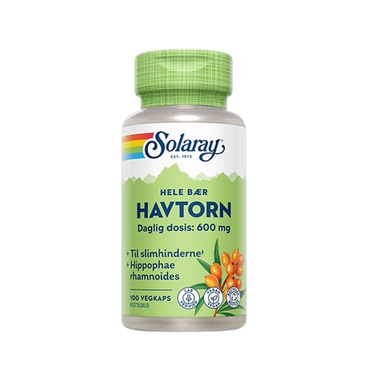 Renhed og Kvalitet fra Solaray Som altid med Solaray, får du et produkt af højeste kvalitet. Hver veganske kapsel indeholder 300 mg rent pulver fra hele havtornbærret (både frugtkød, kerner og saft) for at sikre det fulde spektrum af plantens gavnlige stoffer. Med 100 kapsler i bøtten har du nok til 50 dages forbrug.