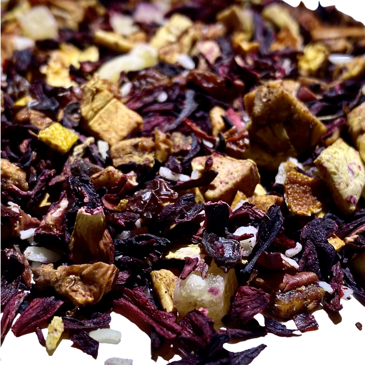 Ingredienser: Æblestykker, hibiscusblomster, appelsinskaller, hybenskaller, ananasstykker, aroma, kokosflager.