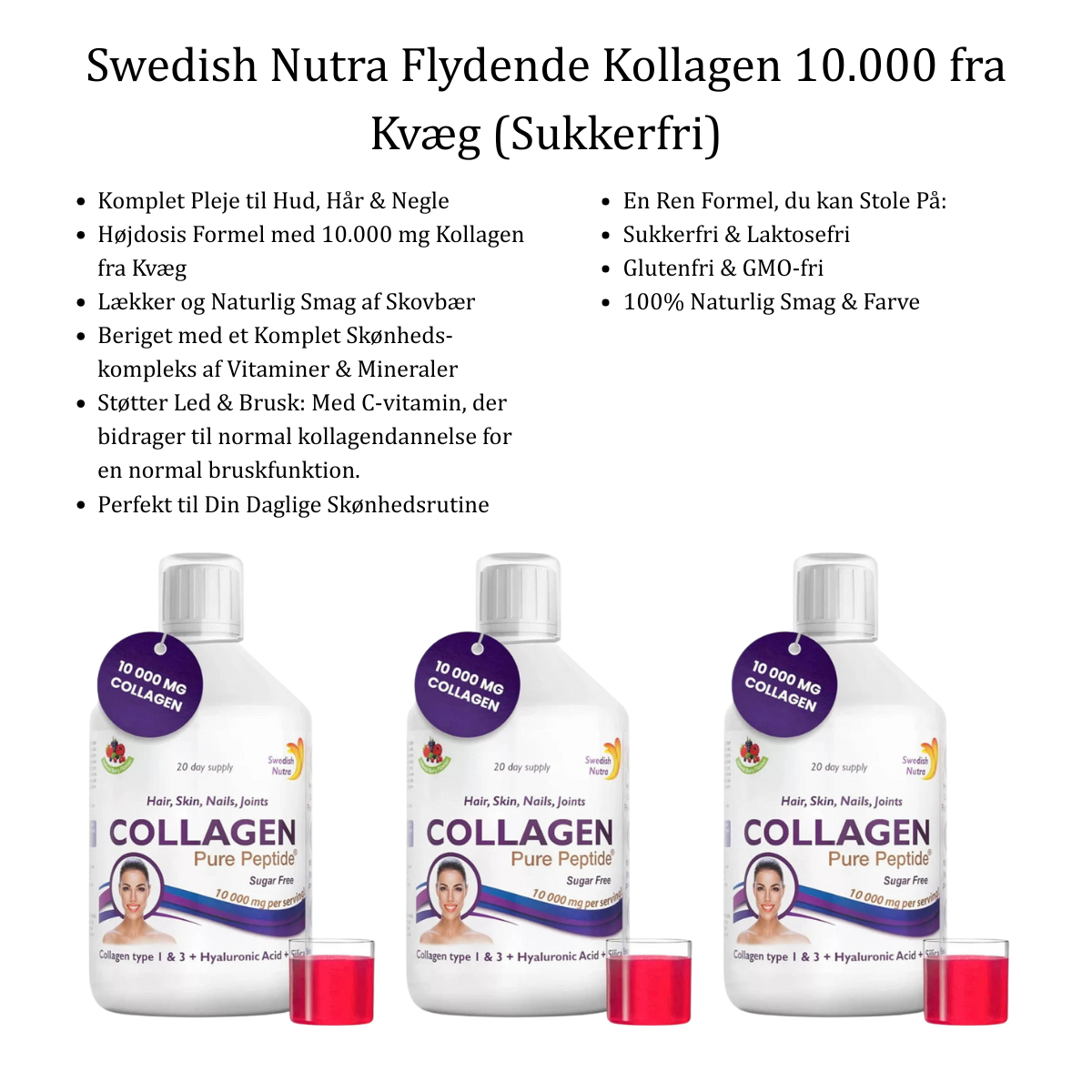 Flydende og Sukkerfri Swedish Nutra har knækket koden til et velsmagende, flydende tilskud helt uden sukker. Det er sødet med stevia og sukralose og smagssat med naturlige bær. Den flydende form sikrer ikke bare god smag, men også at du slipper for besværet med at sluge store piller eller blande klumpet pulver op. Det er "Grab-and-Go" skønhedspleje.