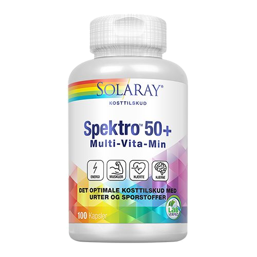 • Et Solidt Fundament for Livets Bedste År: Mød Spektro 50+ Livets midte og de efterfølgende år er en tid fyldt med aktivitet, erfaring og nye muligheder. For at få det meste ud af denne tid er det afgørende, at kroppen har det ernæringsmæssige fundament i orden. Solaray Spektro 50+ er udviklet som et komplet og højkvalitets kosttilskud, der er specielt designet til at imødekomme de behov, der ofte opstår, når man runder de 50.