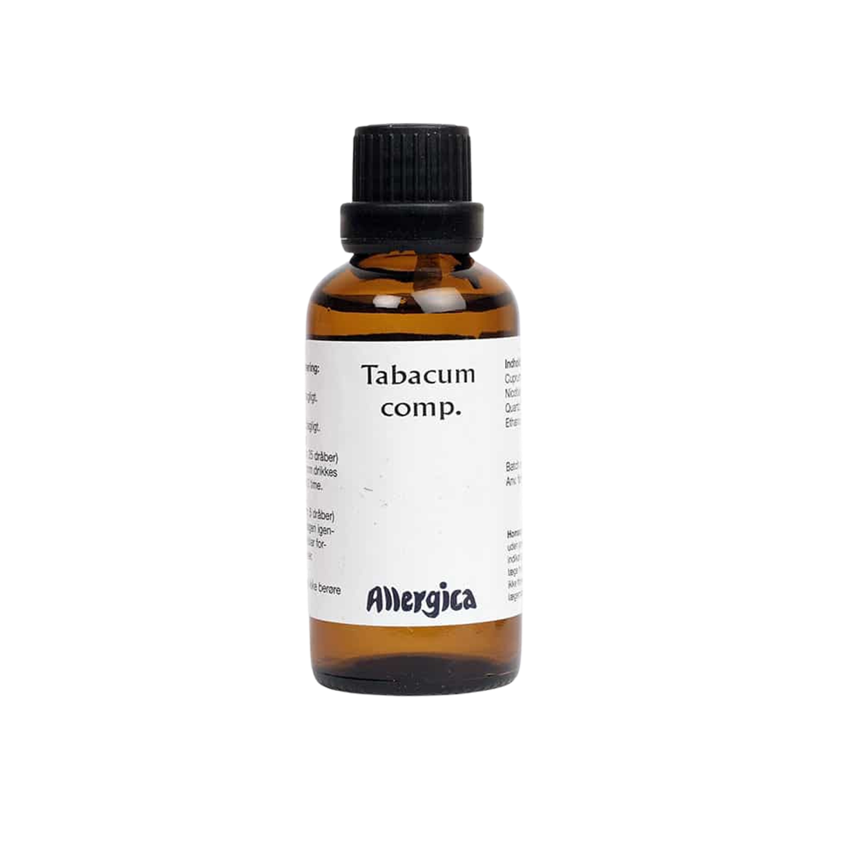 Dette er et håndpotenseret homøopatisk lægemiddel i dråbeform fra den danske producent Allergica. Tabacum comp. er et såkaldt kompleksmiddel, der er skabt med en særlig sammensætning af tre forskellige aktive stoffer fra plante- og mineralriget.