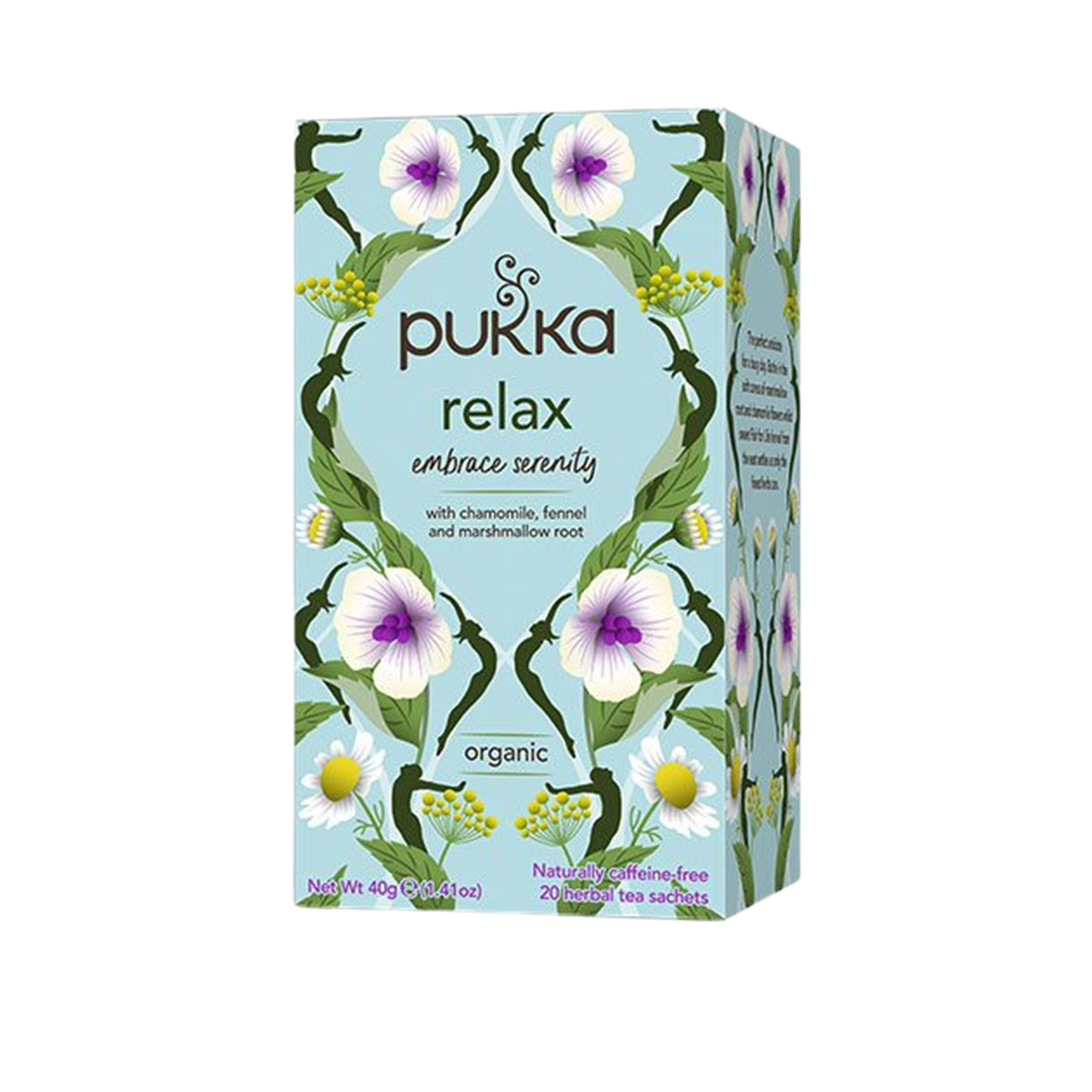 En Te til Alle Tider Pukka Relax forveksles ofte med en decideret godnat-te, men den er meget mere end det. Da den ikke indeholder tunge, søvndyssende rødder som baldrian, gør den dig ikke døsig. Den hjælper blot med at fjerne toppen af stressen. Derfor er den lige så velegnet klokken 14.00 på kontoret, som den er klokken 21.00 i stuen.