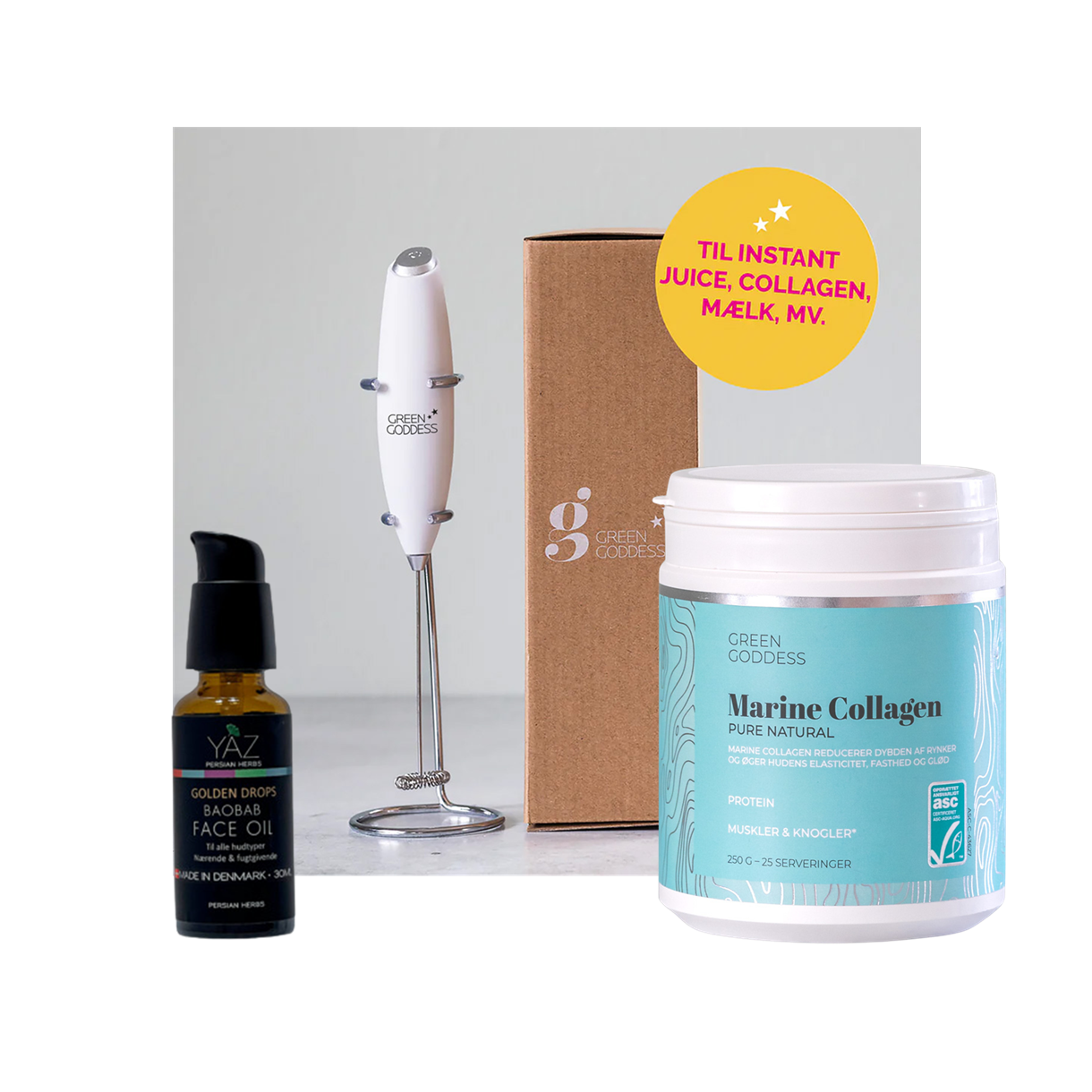 1. PLEJE INDEFRA: Green Goddess Marine Collagen Pure Natural (250g) Dette er fundamentet for din skønhedspleje. Et rent, smagsneutralt og højkvalitets pulver af hydrolyseret marint kollagen. Kollagen er den vigtigste byggesten i hudens bindevæv. Dette pulver er beriget med C-vitamin, som er en afgørende partner, da det bidrager til den normale dannelse af kollagen, der har betydning for en normalt fungerende hud. Den smagsneutrale formel gør den utrolig alsidig – bland den i din morgenkaffe, smoothie, juice eller yoghurt.