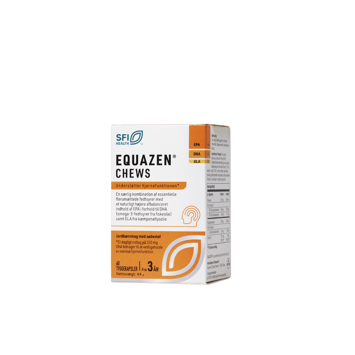 Equazen Chews indeholder den samme unikke og videnskabeligt baserede sammensætning af fedtsyrer som de klassiske Equazen-kapsler, med et naturligt højere indhold af EPA i forhold til DHA. Den bløde gelatinekapsel har en uimodståelig, naturlig smag af jordbær.