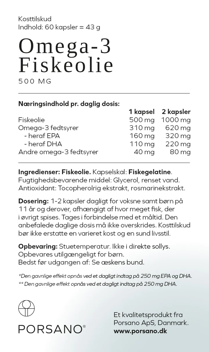 Målrettet Støtte til Din Vigtigste Muskel De essentielle Omega-3 fedtsyrer EPA og DHA er anerkendt af de europæiske sundhedsmyndigheder for deres veldokumenterede effekt på hjertets sundhed. Den gavnlige effekt, at de bidrager til en normal hjertefunktion, opnås ved et samlet dagligt indtag på 250 mg EPA og DHA. Med hele 270 mg i én enkelt kapsel fra Porsano, er du mere end rigeligt dækket ind og opnår den ønskede effekt, selv ved den mindste anbefalede dagsdosis.