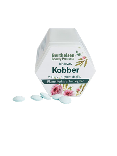 Kobber er et ofte overset "skønhedsmineral". Det spiller en afgørende rolle for din hud og dit hår, da det bidrager til en normal pigmentering. Samtidig er kobber en vigtig medspiller, når det gælder dannelsen af bindevæv, som er det væv, der holder huden fast og smidig. Med hele 200 tabletter i dåsen har du til mere end et halvt års forbrug.